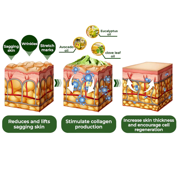 GFOUK™️ Avocado Ageless Body Cream Scrub reduces and lifts sagging on the skin through its combination of key ingredients. Avocado oil, eucalyptus oil and clove leaf oil stimulate collagen production, increase skin thickness and encourage cell regeneration, ultimately diminishing the appearance of wrinkles and sagging. The cream’s biochemistry replenishes collagen diminishing sagging and wrinkles while also replenishing hydration, making skin look supple and youthful.