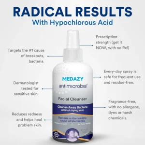 According to Dr. Collins, MD., a board-certified dermatologist in Los Angeles, “Medazy® Antimicrobial Facial Cleanser is highly effective for treating acne because it targets the bacteria causing breakouts without causing irritation. Hypochlorous acid is a well-known antimicrobial ingredient that not only kills bacteria but also soothes the skin, making it perfect for anyone dealing with acne or skin sensitivity.”