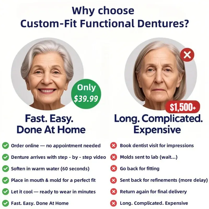Traditional dentures often lead to bone loss, facial sagging, and discomfort over time, while Custom-Fit Functional Dentures offer a modern solution with a self-molding, adhesive-free design that ensures a secure, natural fit. Made with advanced 3D printing and medical-grade materials, these award-winning dentures restore your smile, improve facial appearance, and provide long-lasting comfort trusted by over 1,000 dental professionals.