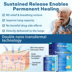 Cvreoz® DoubleNano is the first scientifically-proven transdermal patch with a documented 94.7% success rate for restoring healthy lung function at home. Thanks to its innovative DoubleNano Transdermal Technology, it penetrates up to 500% deeper into lung tissue compared to conventional inhalers and pills, showing visible breathing improvements within 48–72 hours.