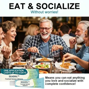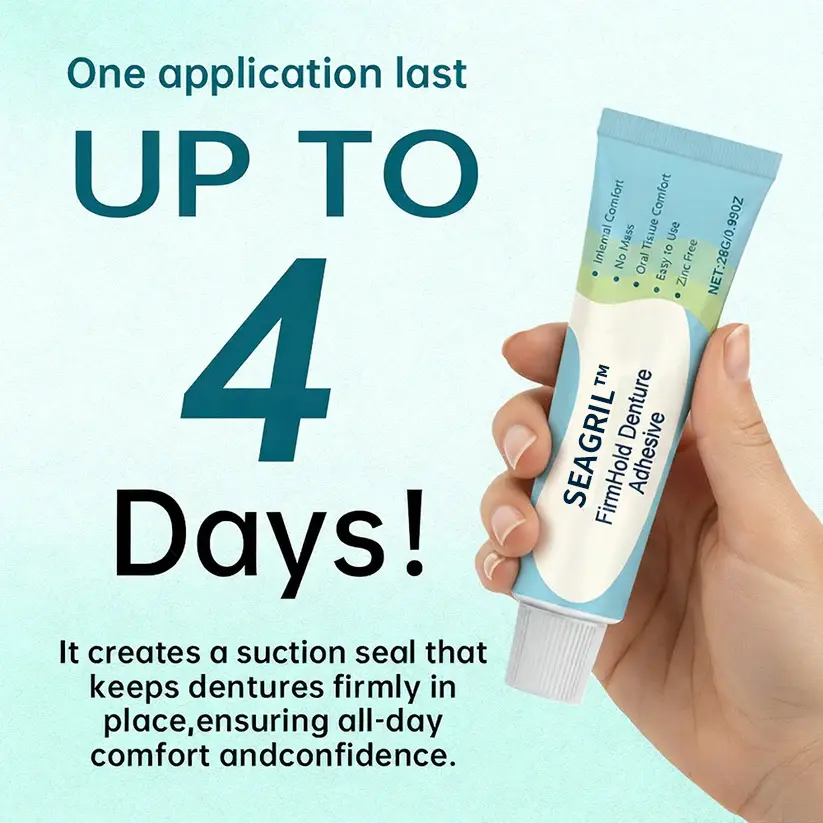 Unlike messy pastes or unreliable powders, SEAGRIL® Firm Hold Denture Adhesive is waterproof, food-resistant, and lasts up to 4 days without needing reapplication. Whether you’re eating, speaking, or laughing, your dentures stay firmly in place, giving you worry-free confidence throughout the day.