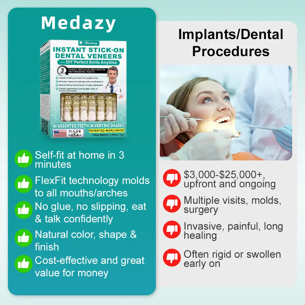 “I’ve had issues with my teeth for years, and it really took a toll on my confidence. Before I found Medazy® Instant Stick-on Dental Veneers, I felt super self-conscious about smiling or even talking too much. My teeth were crooked and discolored, so I’d avoid any situation where I might have to show them.