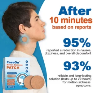 Experience a journey without the hassle of motion sickness, thanks to the cutting-edge EaseOn™ Motion Sickness Patch. Designed for travelers on the go, this innovative solution offers fast and effective relief from nausea, whether you’re cruising by car, boat, plane, or train. Bid farewell to the discomfort of motion sickness and say hello to hassle-free travel with EaseOn™. Your joyful adventures await!