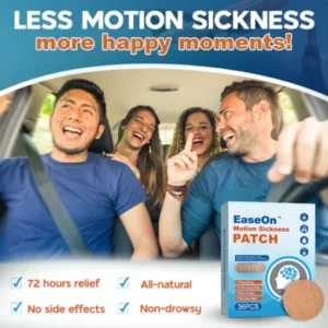 Experience a journey without the hassle of motion sickness, thanks to the cutting-edge EaseOn™ Motion Sickness Patch. Designed for travelers on the go, this innovative solution offers fast and effective relief from nausea, whether you’re cruising by car, boat, plane, or train. Bid farewell to the discomfort of motion sickness and say hello to hassle-free travel with EaseOn™. Your joyful adventures await!