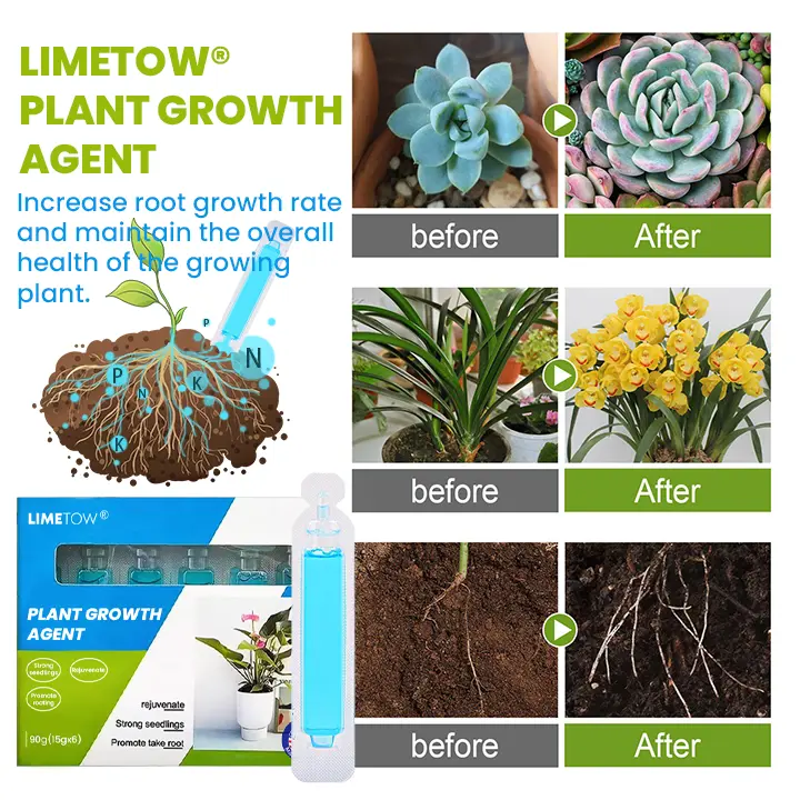 The LIMETOW® Plant Revitalizer is expertly formulated to combat the common causes of plant stress and poor growth. This advanced plant regenerator accelerates root development, quickly promoting stronger, thicker roots that help plants absorb more nutrients and water. It stimulates growth resumption in dormant plants, aiding in faster recovery and revitalization.