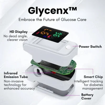 The Glycenx™ Precision Glucose Monitoring Device is an easy-to-use device that measures glucose levels quickly and painlessly.