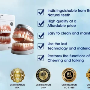 Instant Perfect Smile: Transform your smile instantly with the . Experience the satisfaction of achieving a flawless. customized fit right away. Our innovative denture set eliminates the discomfort of poorly fitting dentures. offering you a snug and natural feel that makes your dentures feel like a true part of your mouth. Say goodbye to sore spots and irritation as Denture Set provides immediate relief. allowing you to enjoy your smile with newfound confidence and comfort. Enjoy a seamless transition to a better-fitting. more comfortable denture experience without delay.