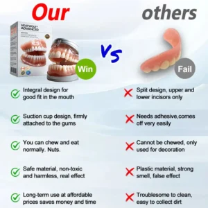 Instant Perfect Smile: Transform your smile instantly with the . Experience the satisfaction of achieving a flawless. customized fit right away. Our innovative denture set eliminates the discomfort of poorly fitting dentures. offering you a snug and natural feel that makes your dentures feel like a true part of your mouth. Say goodbye to sore spots and irritation as Denture Set provides immediate relief. allowing you to enjoy your smile with newfound confidence and comfort. Enjoy a seamless transition to a better-fitting. more comfortable denture experience without delay.