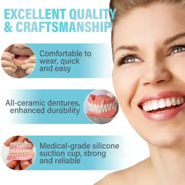 Easy Fit, Seamless Comfort: Enjoy dentures that adapt perfectly to your mouth from the moment you put them on. Our cutting-edge design ensures a snug and secure fit, providing exceptional comfort that feels like a natural part of your mouth. You can go about your day with confidence, free from discomfort or shifting, allowing you to eat, speak, and smile without any hassle or worry.