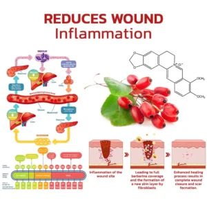 Berberine – It has anti-inflammatory properties, inhibiting the production of inflammatory factors and reducing inflammation at the wound site. It facilitates wound healing by stimulating the proliferation of fibroblasts and keratinocytes, thus accelerating the growth and renewal of new cells. It can inhibit the proliferation of bacteria in the wound and reduce the risk of infection, which speeds up the wound healing process. By reducing glucose release, berberine can help improve blood sugar control.