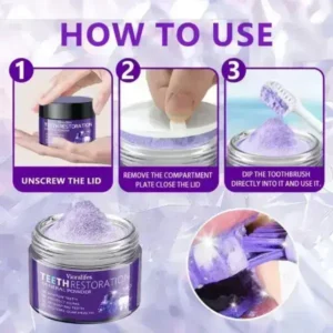 Experience noticeable whitening results in just one week with Vioralifes™ Teeth Restoration Mineral Powder. Purple is the opposite and complementary color of yellow on the color wheel, so applying water-soluble purple dye to your teeth will counteract any yellow undertones. Plus, its vitamin C-rich formula removes plaque, tartar, and discoloration, restoring teeth to their natural whiteness.