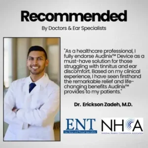 Medical experts now recommend Audinix™ as a breakthrough tinnitus solution, backed by science. Dr. Erickson Zadeh, a leading audiology specialist, praises its NeuroPulse Therapy, which calms overactive auditory nerve signals at the root of tinnitus. “Audinix™ is one of the most effective, non-invasive solutions I’ve seen in my career,” he states. With strong clinical results and expert endorsements, Audinix™ is the trusted choice for those seeking fast, lasting relief from tinnitus.